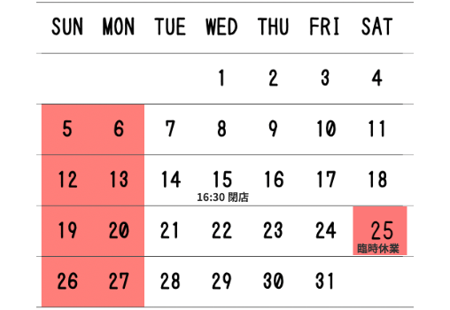 営業時間の変更や短縮、臨時休業などがございましたら、こちらでお知らせいたします。ご理解のほど、よろしくお願い申し上げます。